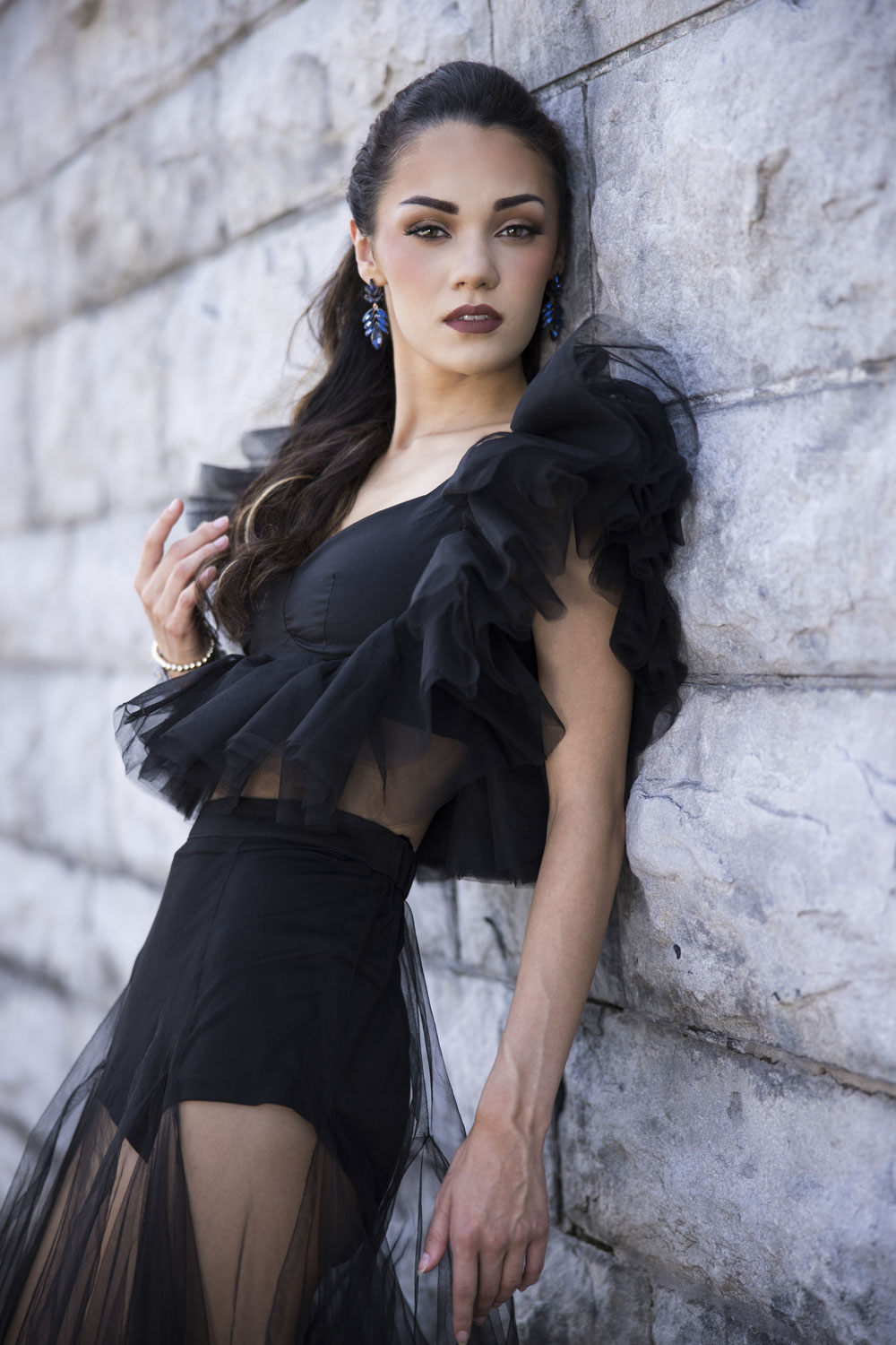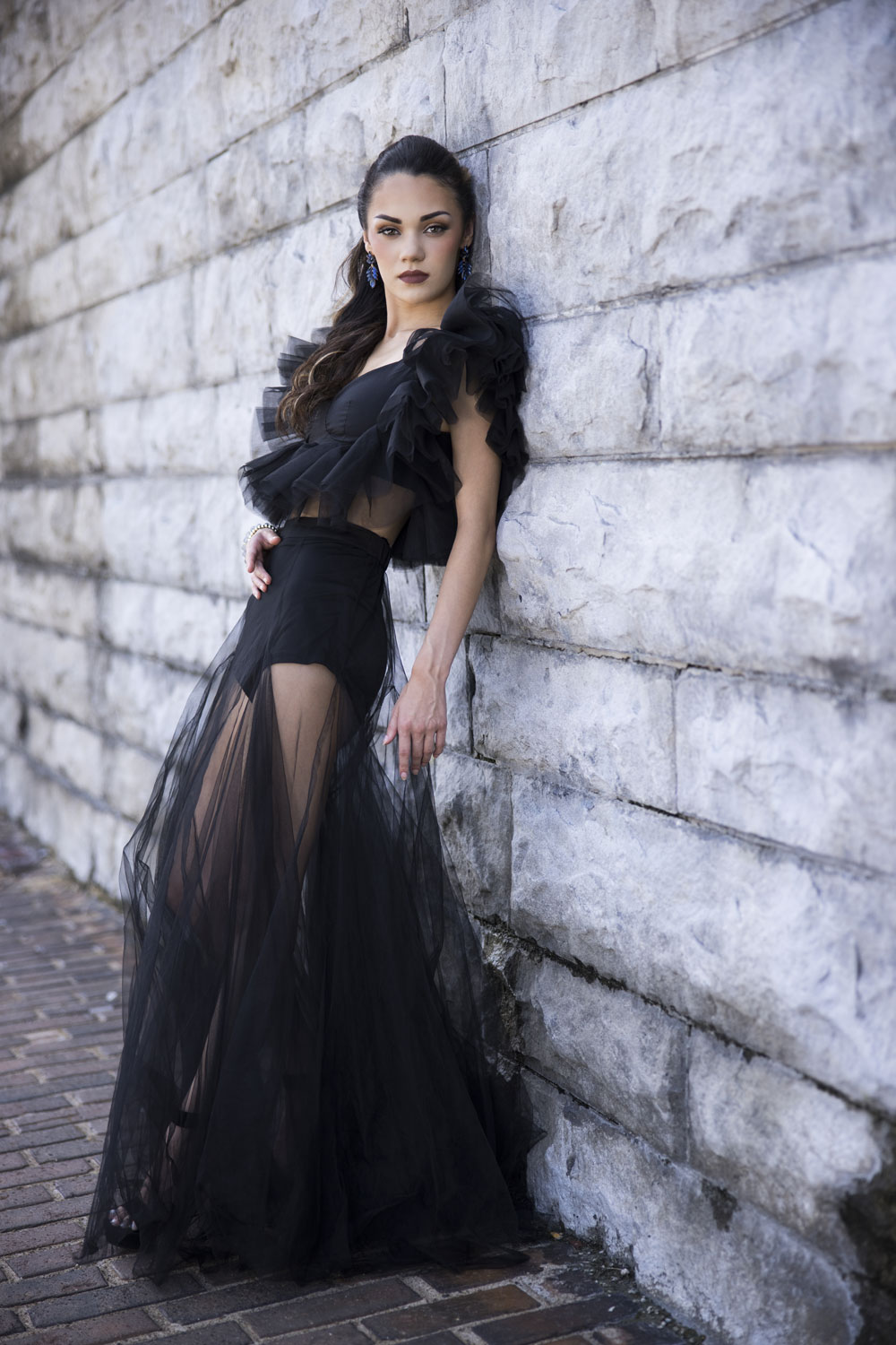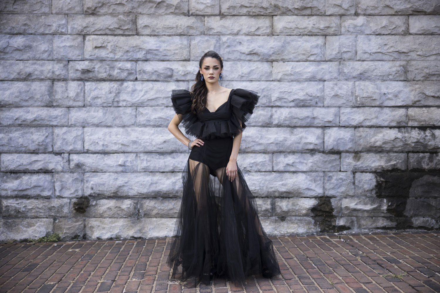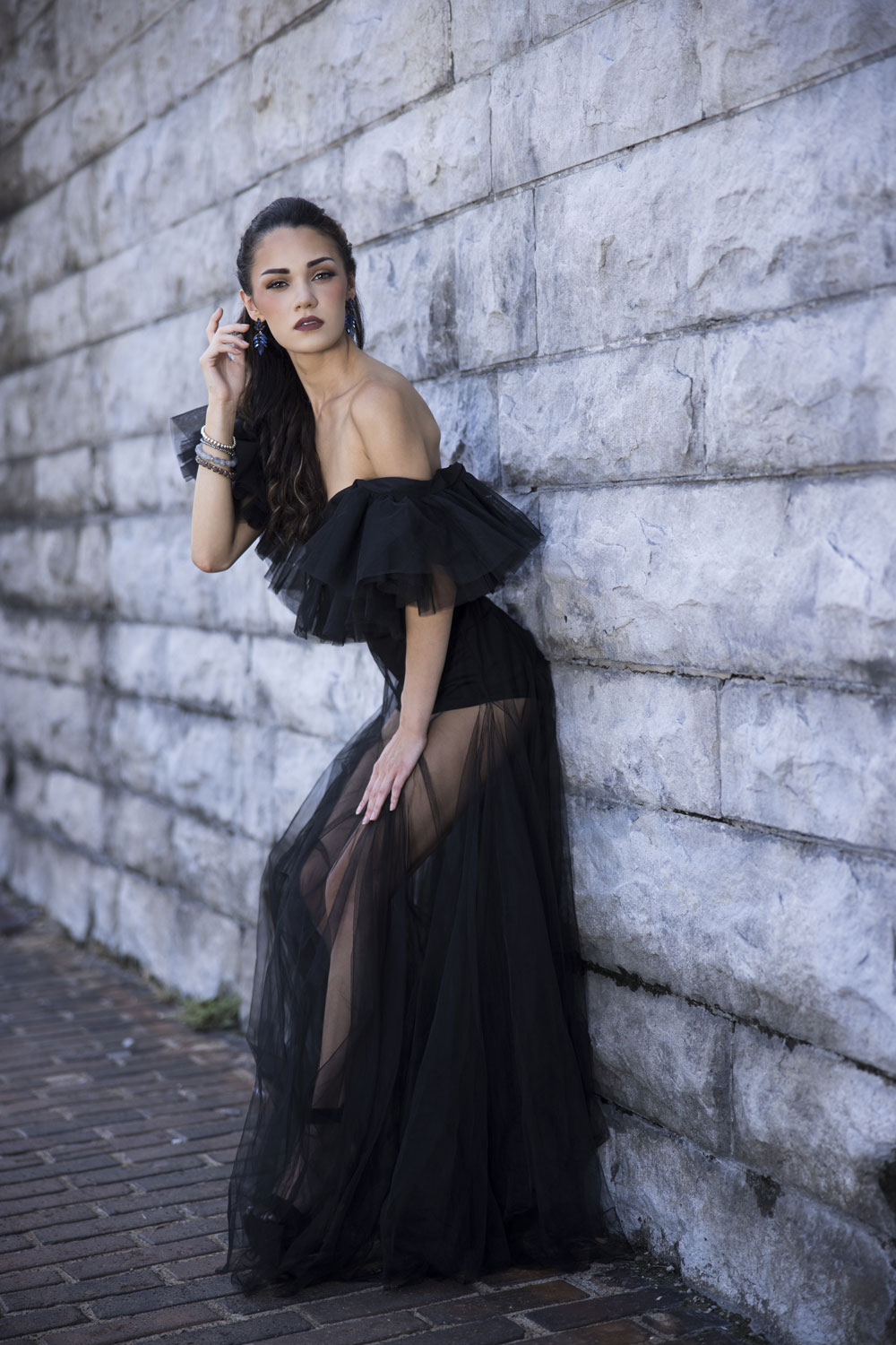 Once the basic lighting was nailed down, we played with angles and composition. By shooting from one side of the wall and positioning the model toward the bottom left of the frame, the bricks led the viewer’s eye straight toward her face.