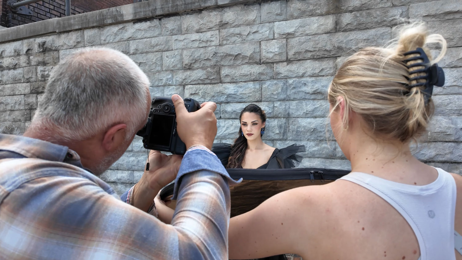 Shooting in harsh sunlight can make or break your shot. When the sun slipped behind the clouds, we used that moment of soft, open shade to start shooting. Even lighting like that can be flattering — but once the sun popped back out, it was time to grab our secret weapon: a reflector.